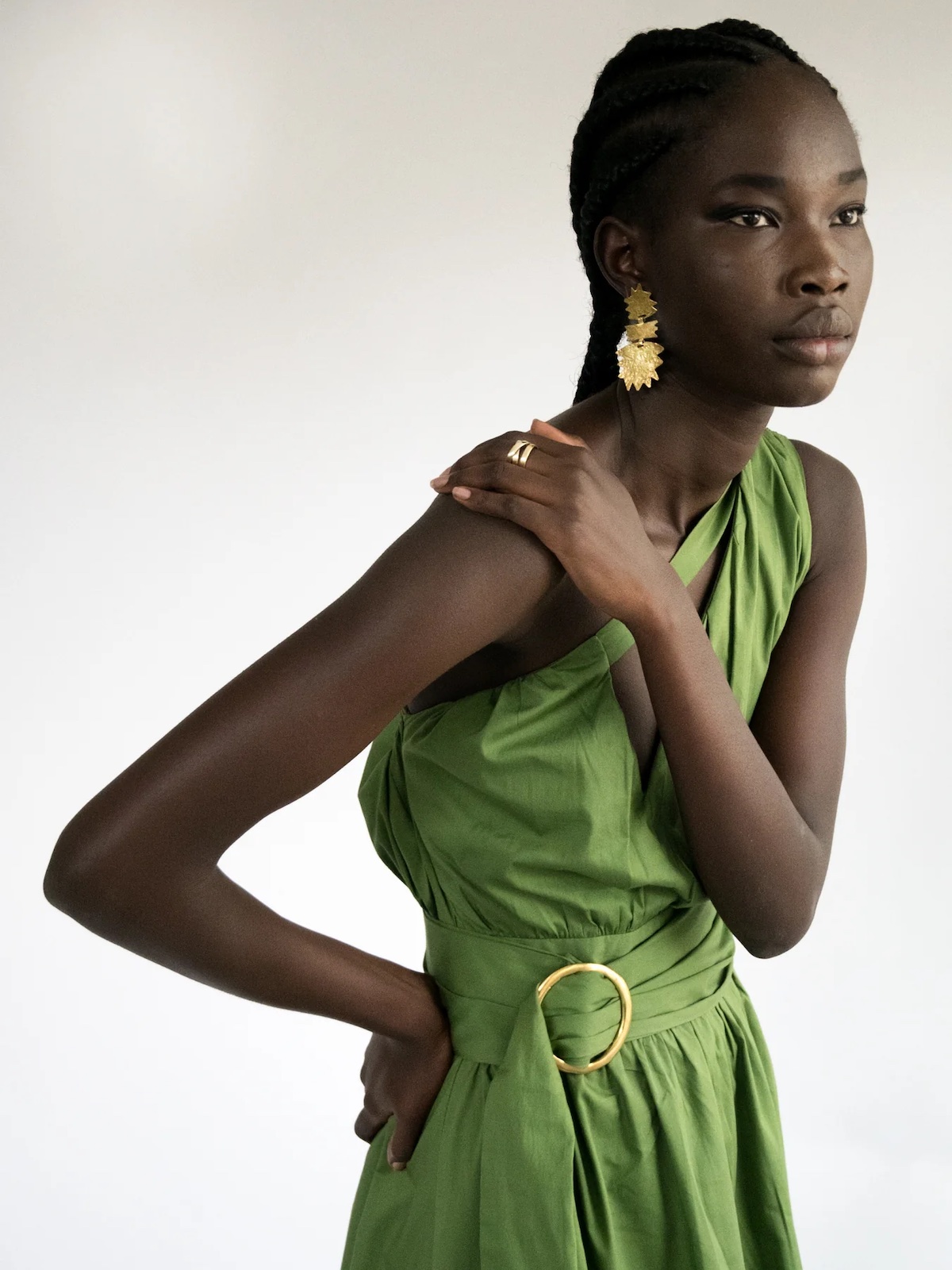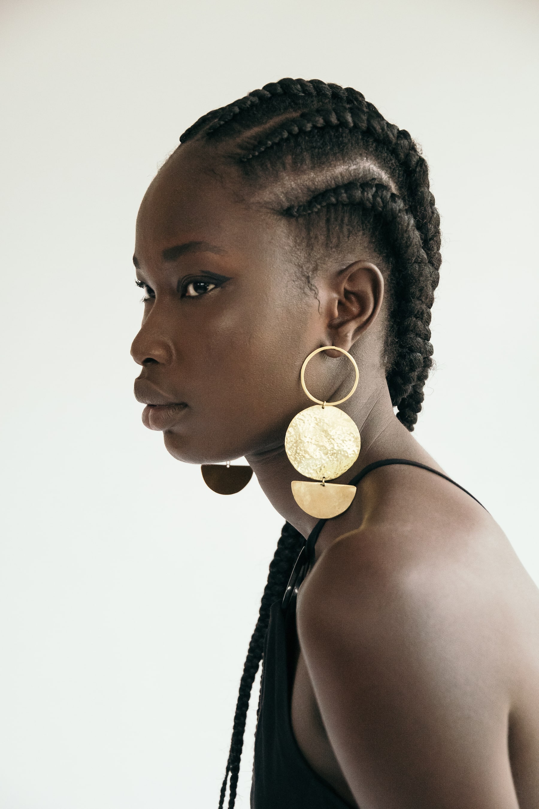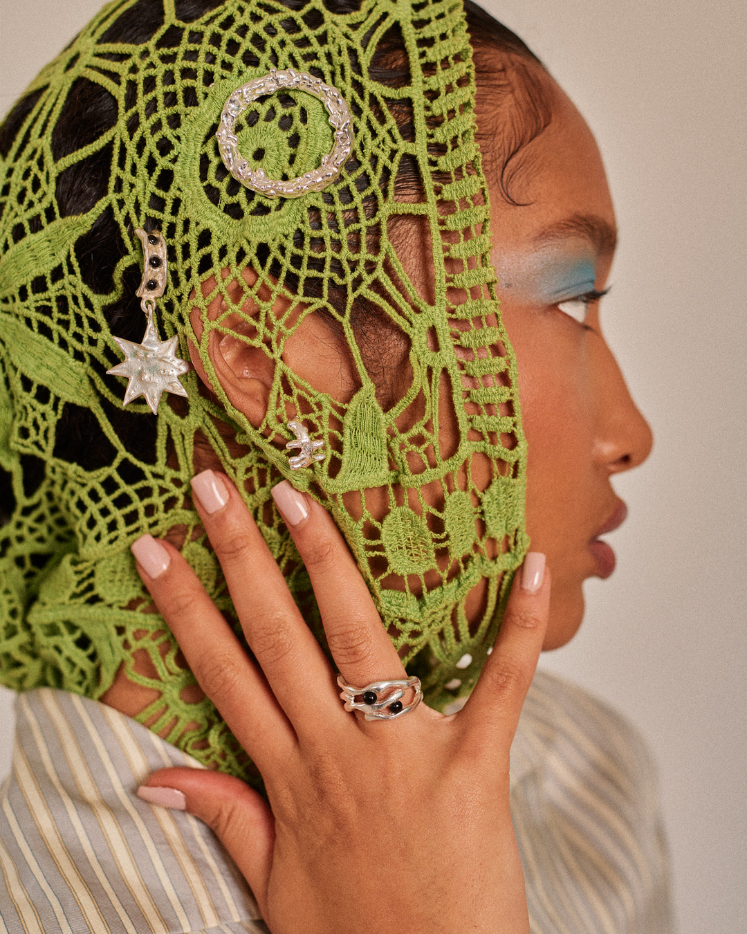 Using materials such as recycled brass, Rift Valley Obsidian, gold, and silver, Studio Doa’s jewelry and clothing designs are brought to life in Kenya by local silversmiths, artisans, and tailors. According to Robertson-Macleod, the precious jewelry pieces are an exploration of the handcrafted form, a way of playing with character and mood through metals. “I really like to look at the primordial elements of body ornaments and explore storytelling through our pieces,” she says.