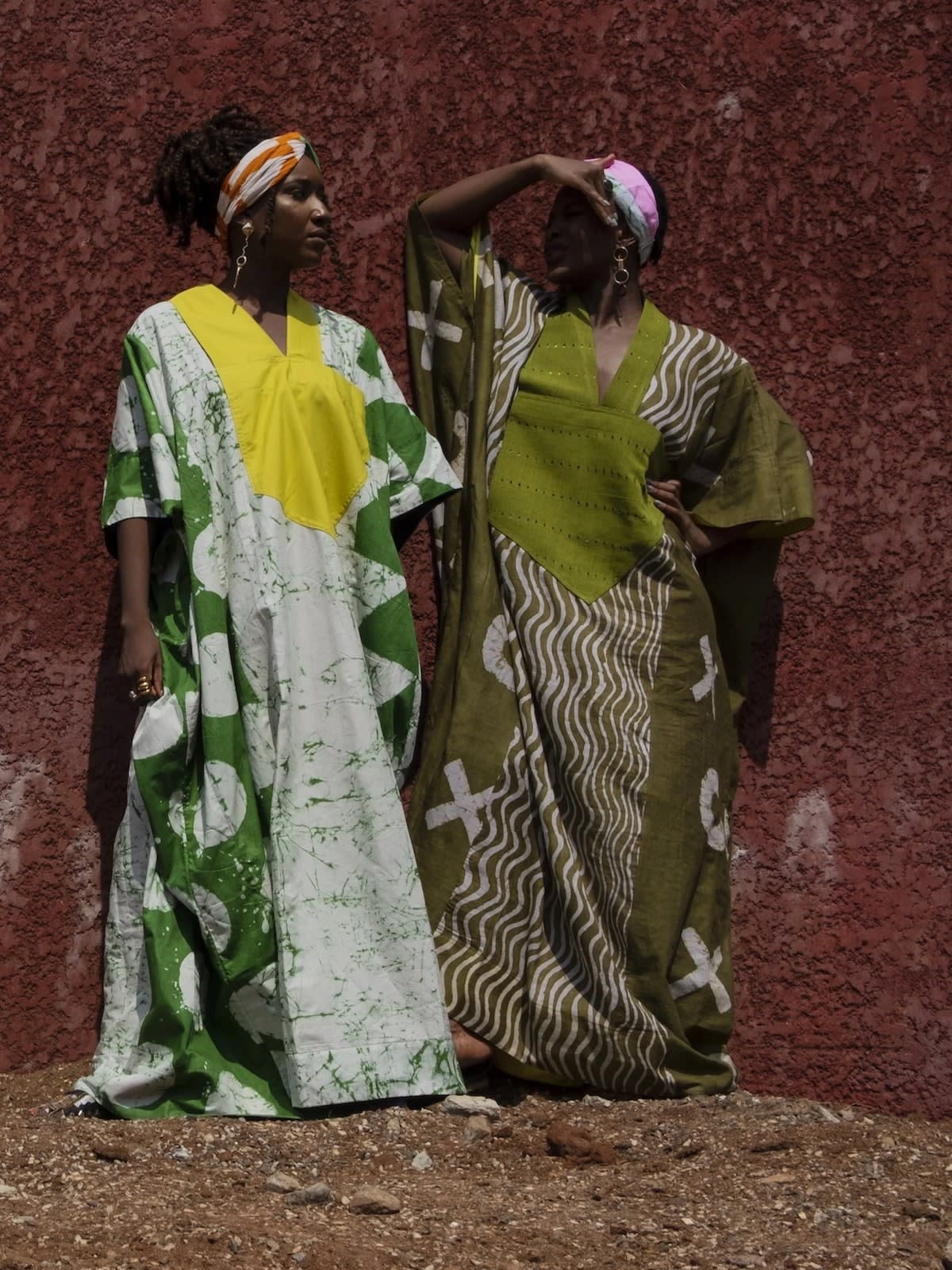 Each Dye Lab piece is created from hand-dyed textiles using batik wax to achieve the brand’s own formulated colors and prints and are primarily crafted from Adire and Aso Oke materials—two fabrics indigenous to South Western Nigeria. Choosing to work with these local materials has empowered the brand to celebrate the beauty of their home-grown design practices while being able to tightly control their production practices. Dye Lab uses each batch of batik wax material repeatedly; the used wax is returned to the original stock and reused during the next round of textile dyeing. Additionally, every collection is produced in small batches, while minimal fabric cutting is employed to ensure nothing is wasted. Any leftover fabrics are used to make other items.