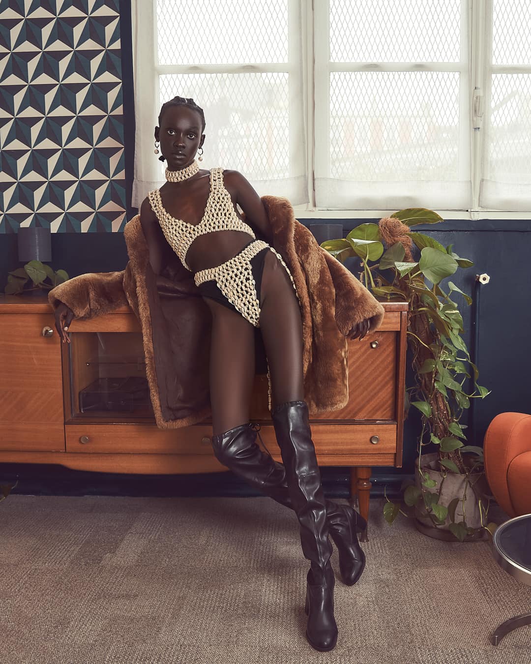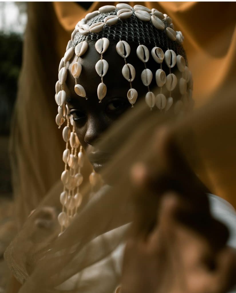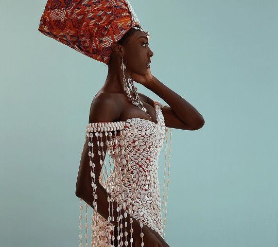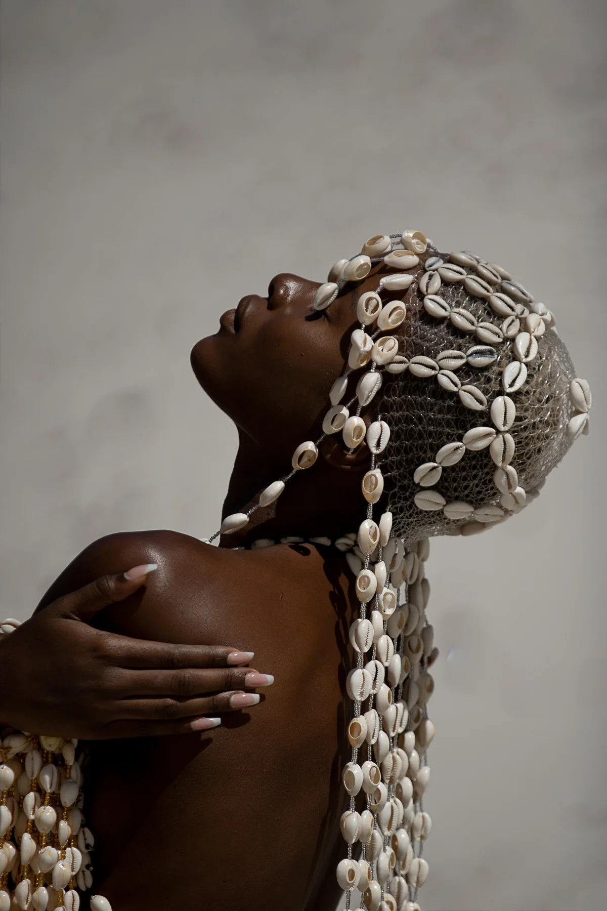 With cowrie shells as her primary material, Lafalaise offers everything from statement pieces and discreet accessories to high-fashion dresses and works of art. She’s most well known for her elaborate headpieces, which are expertly assembled by hand and gracefully sit upon the head. Besides cowries, the brand also makes use of glass beads and nylon. Each piece conceived represents an aspect of Lafalaise’s personality and/or the most distinctive traits of various African deities. Using organic and sustainable materials is at the heart of her collections, seeking to have little or no negative impact on the environment by pushing for a circular economy system.
