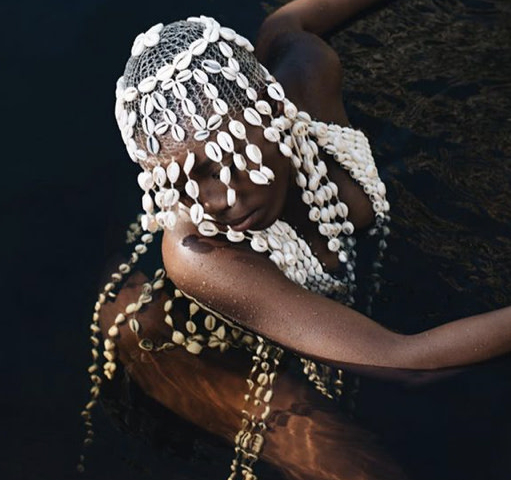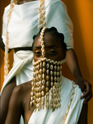 Lafalaise Dion is the eponymous brand of Dion Dewand Marcia Lafalaise, a visual artist, performer, designer, and former journalist. Based in Abidjan, the designer takes inspiration for her clothing, jewelry, art, and modern accessories from the Dan culture of the West of Côte d’Ivoire, particularly cowrie shells which have for centuries been part of West African cultures as everything from currency to symbols of fertility and spirituality. The self-proclaimed Queen of Cowries, Lafalaise considers her handmade creations to be an artistic extension and representation of herself.