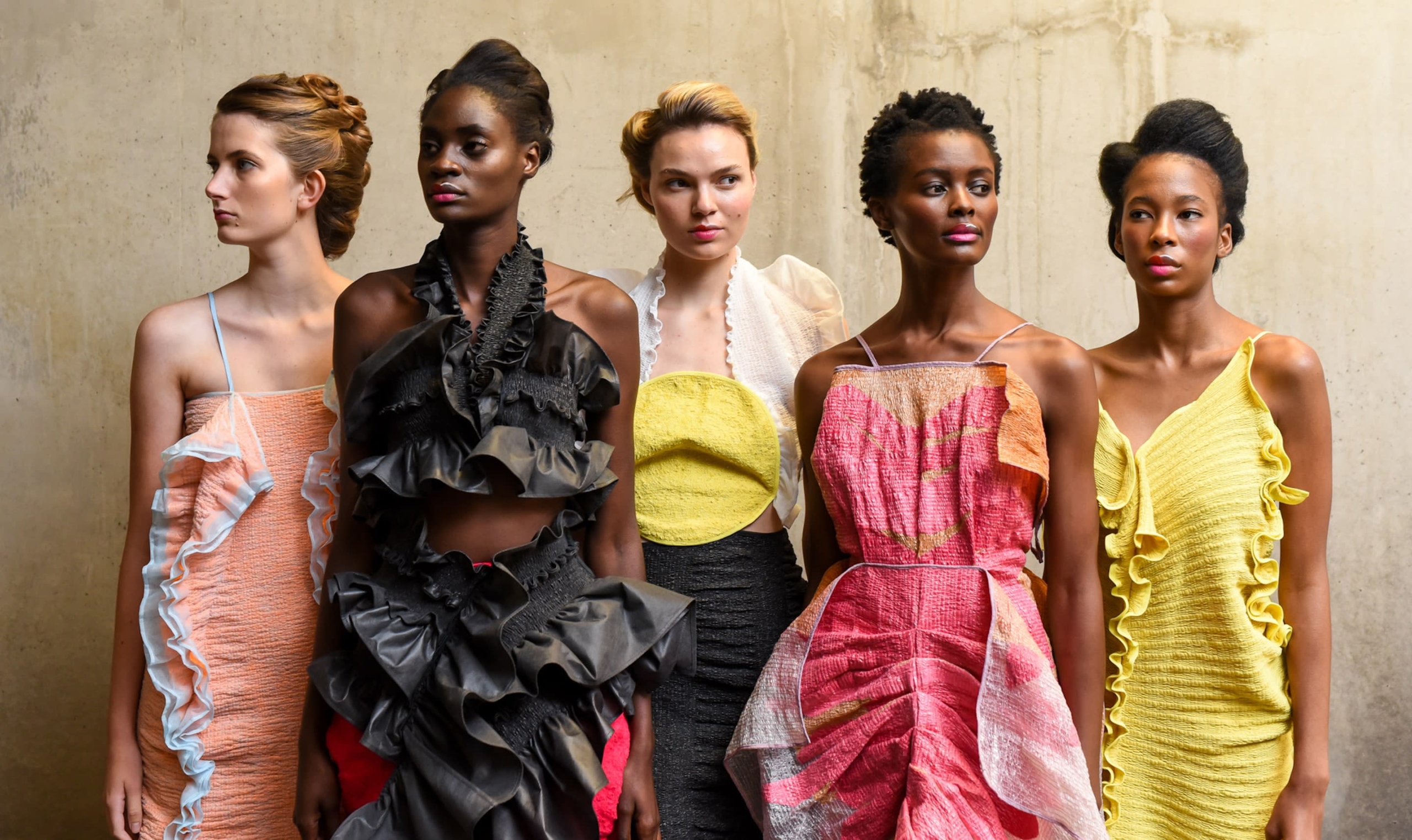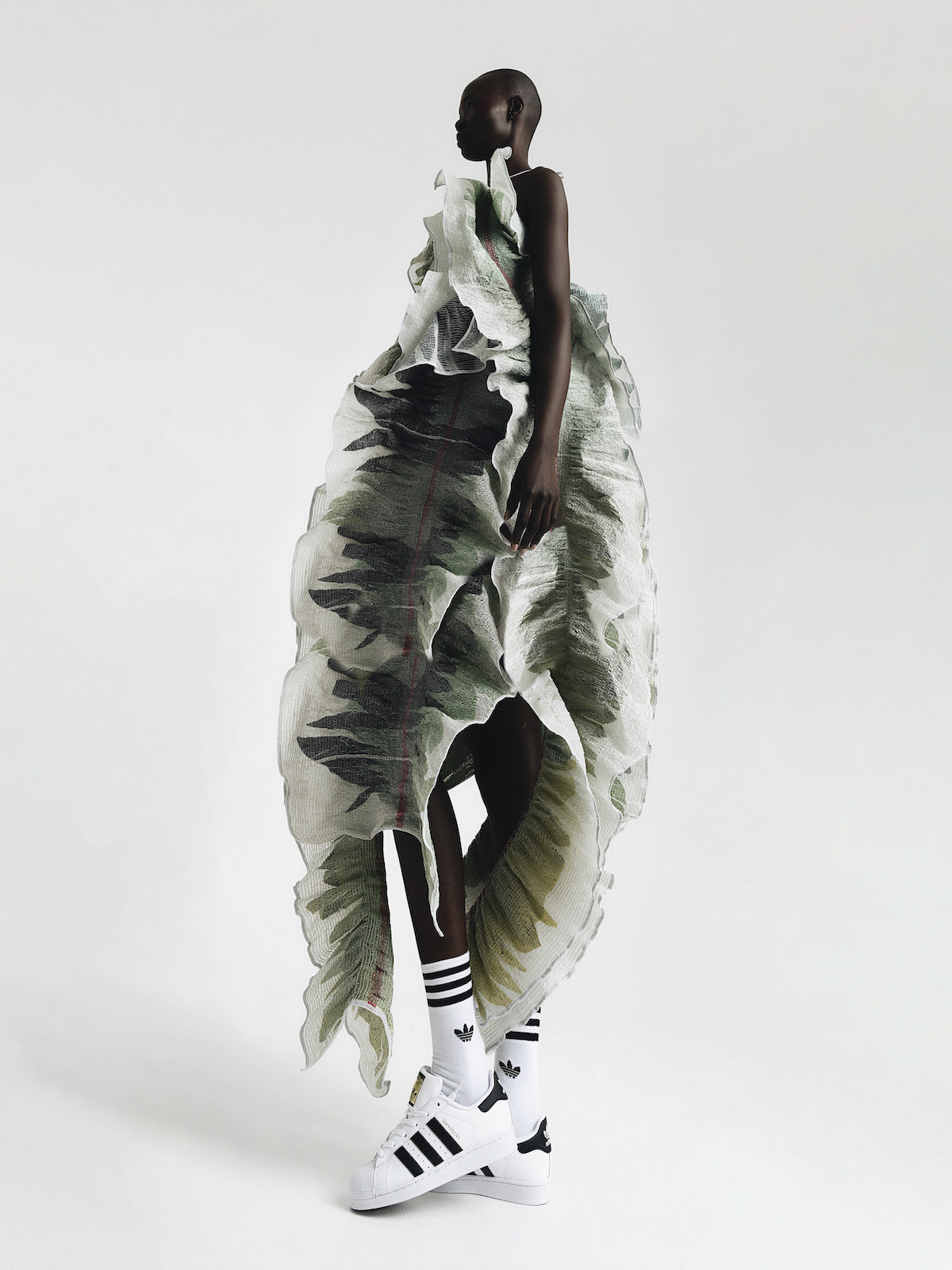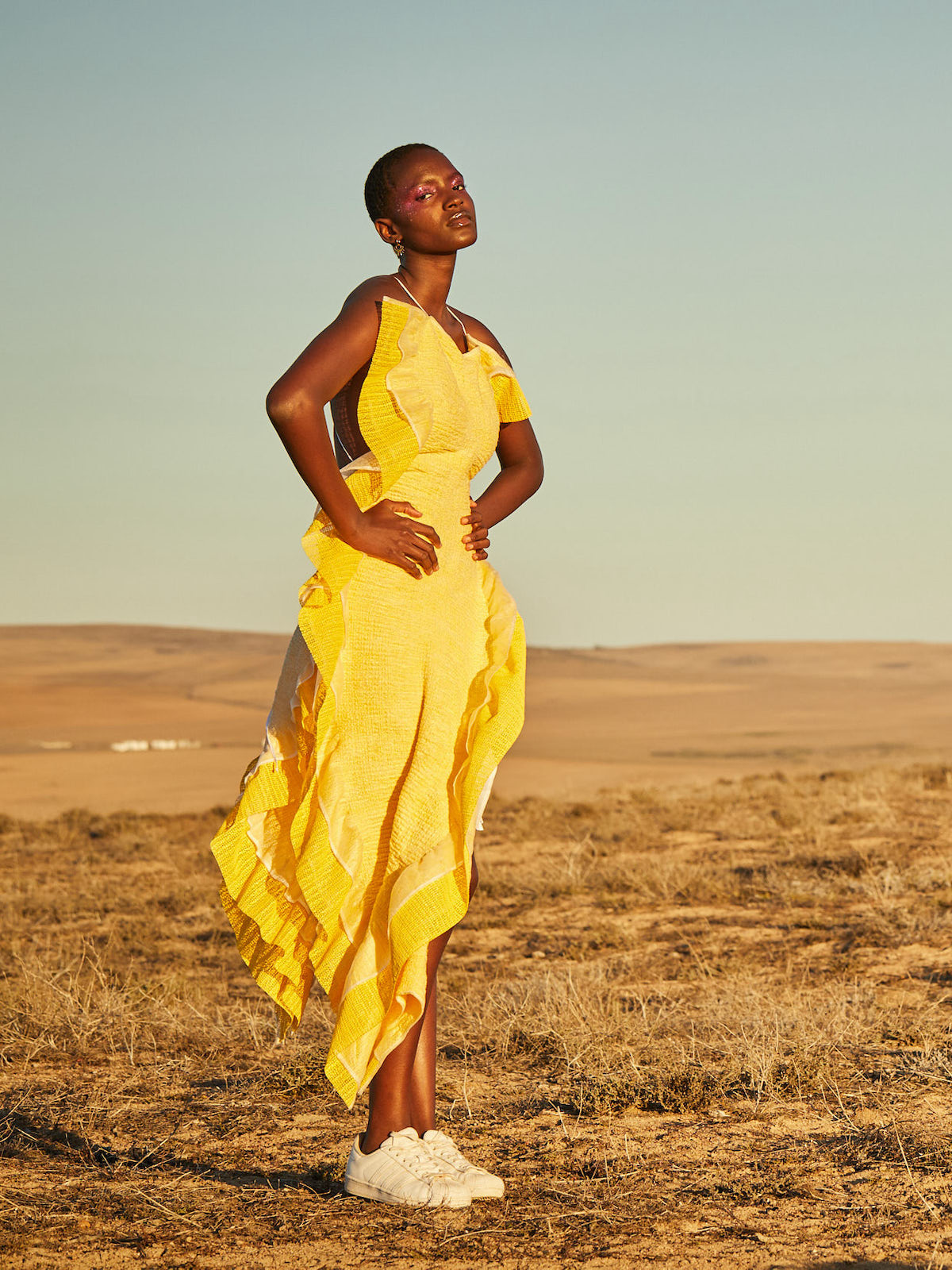 A Cape Town College of Fashion Design (CTCFD) graduate, Klawikowski describes her design and construction process as a labor-intensive and time-consuming one. For her, it all starts with the materials. Inspired by how fabric can be manipulated structurally to form new proportions and silhouettes, this has led to her constant experimentation with recycled, upcycled, and refabricated materials. All the materials are created by hand at her studio using fabric off-cuts otherwise destined for landfills and recycled plastics. Her goal is to transform waste into an elegant garment, all while ensuring total transparency about the materials used. She hopes this will inspire customers to examine all the clothing they purchase and motivate them to be more conscious consumers.